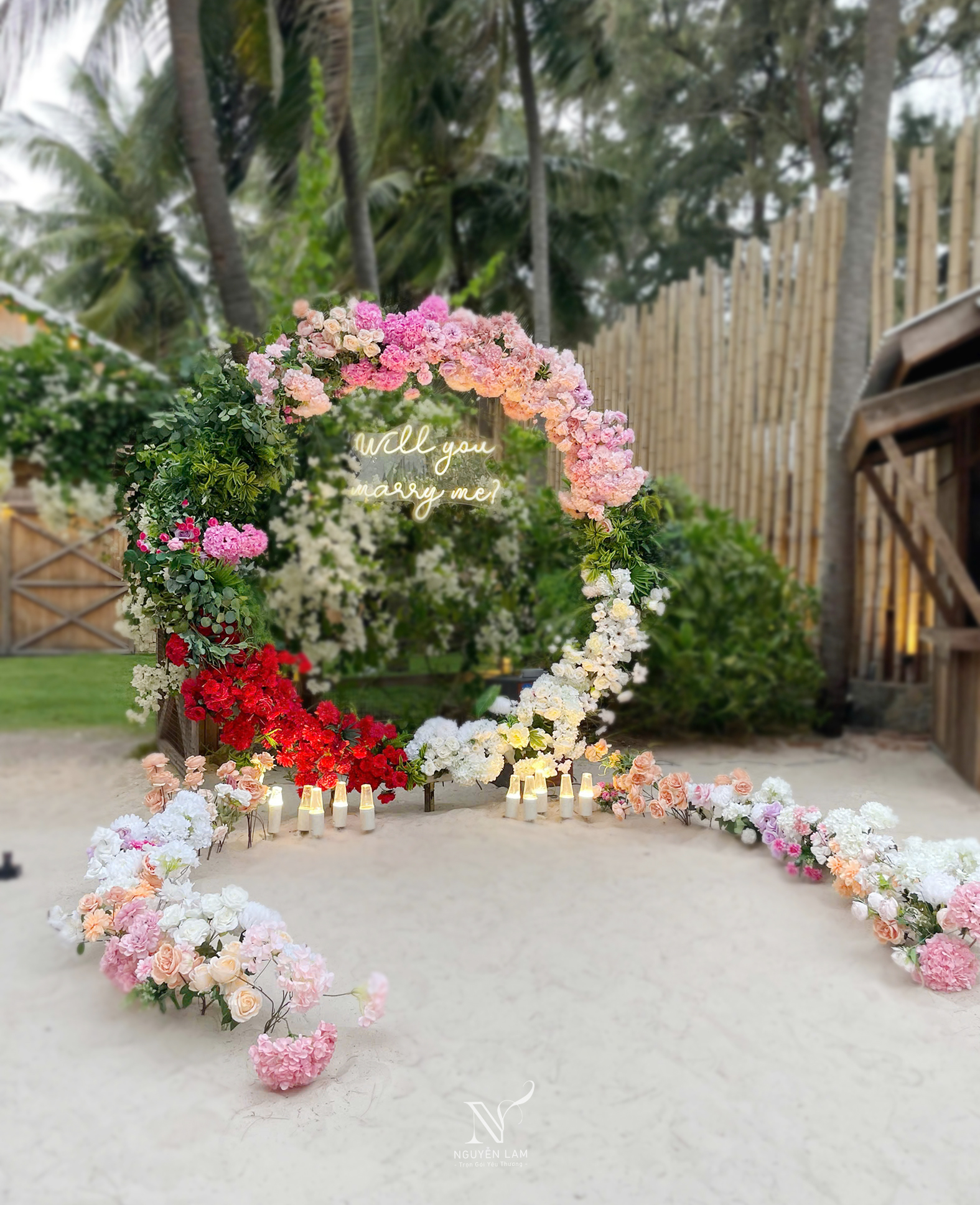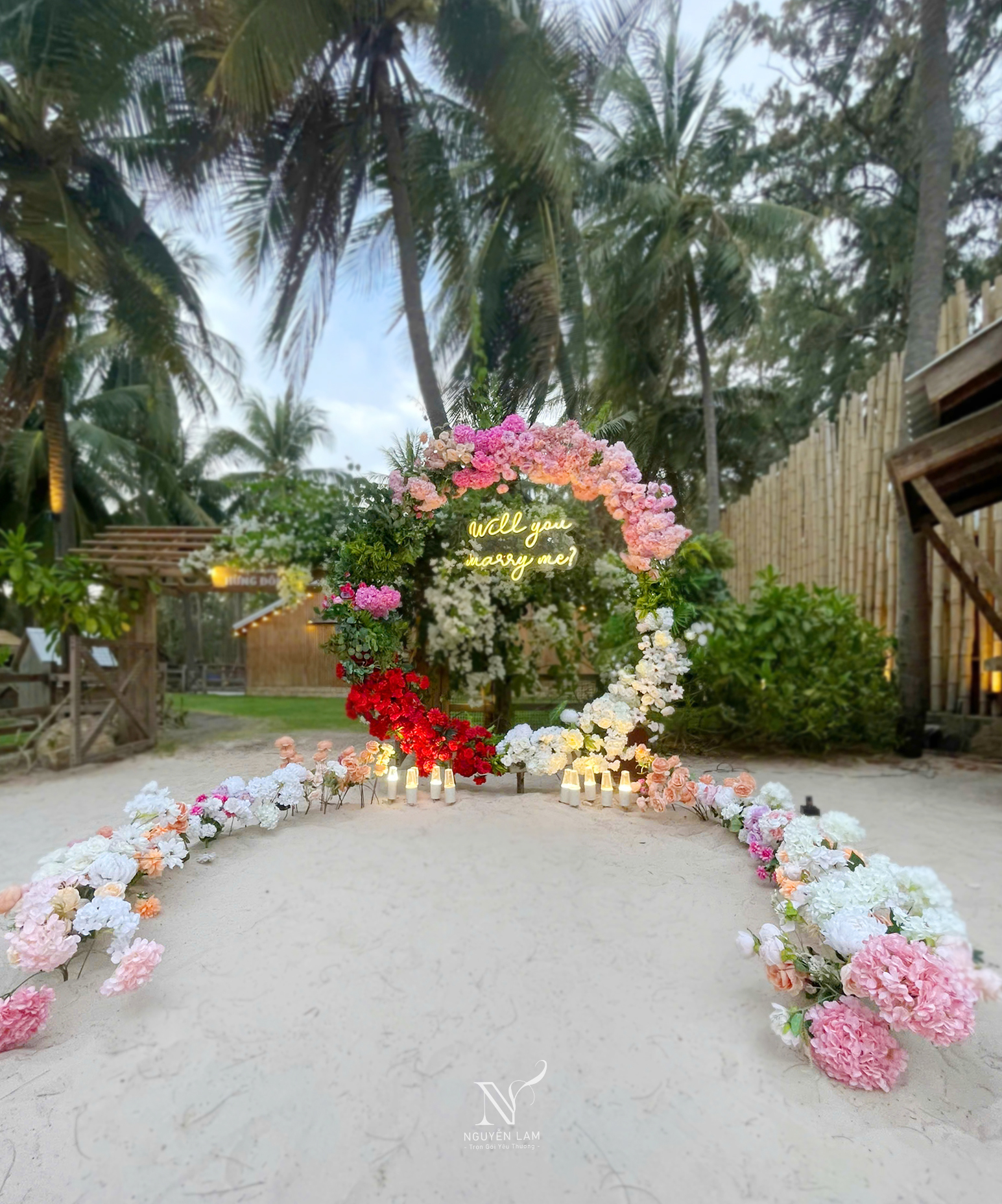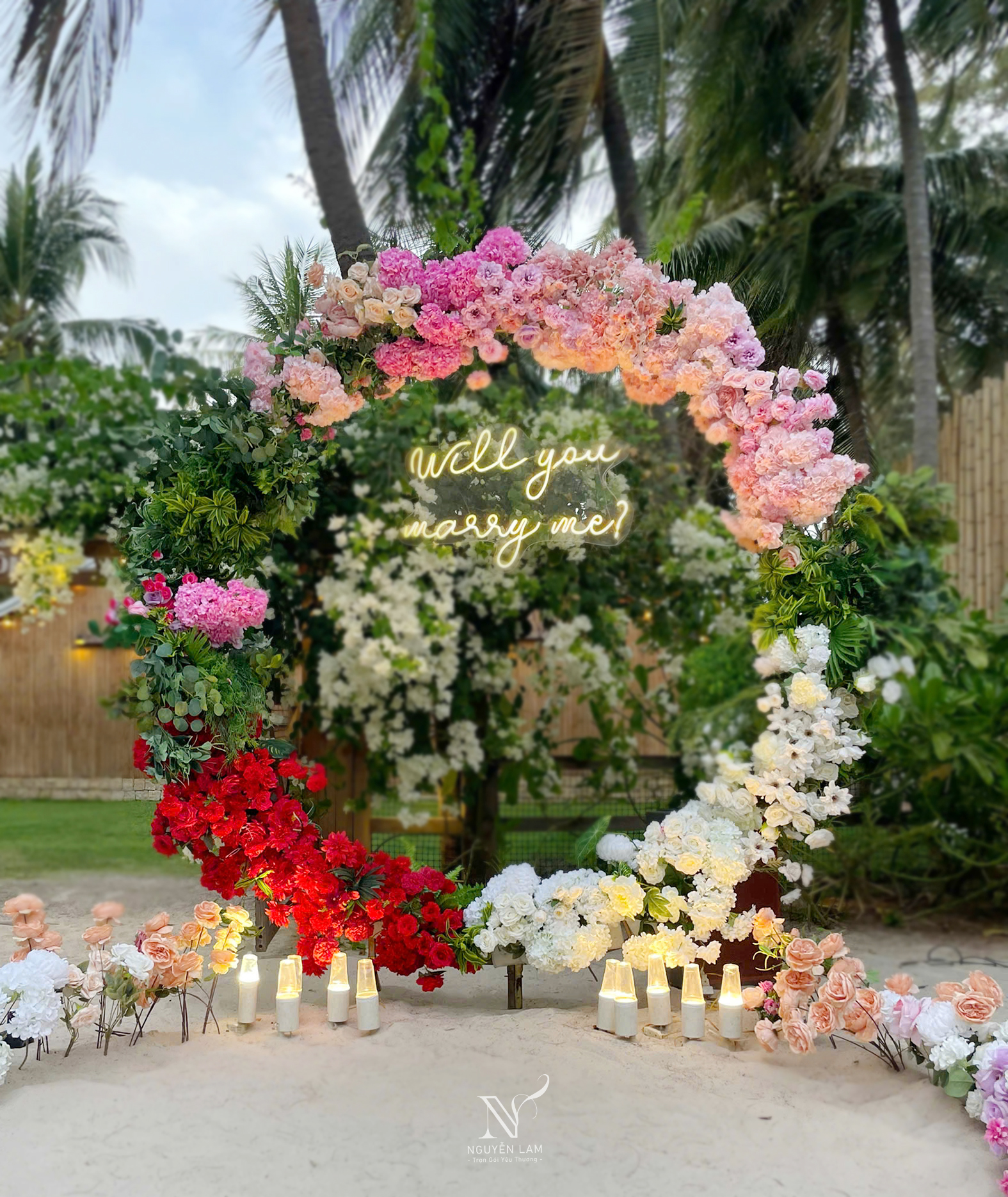 Trong ngày trọng đại nhất của cuộc đời, cổng hoa ngày cưới không chỉ là một lối đi đơn thuần mà còn là biểu tượng rực rỡ, nơi tình yêu thăng hoa và những khoảnh khắc đáng nhớ được ghi dấu. Tại Cưới Hỏi Nguyễn Lam, chúng tôi hiểu rằng mỗi cặp đôi đều ấp ủ một giấc mơ riêng về không gian cưới hoàn hảo. Đó là lý do vì sao chúng tôi luôn nỗ lực kiến tạo nên những cổng hoa độc đáo, biến hóa linh hoạt để phù hợp với mọi phong cách và địa điểm.