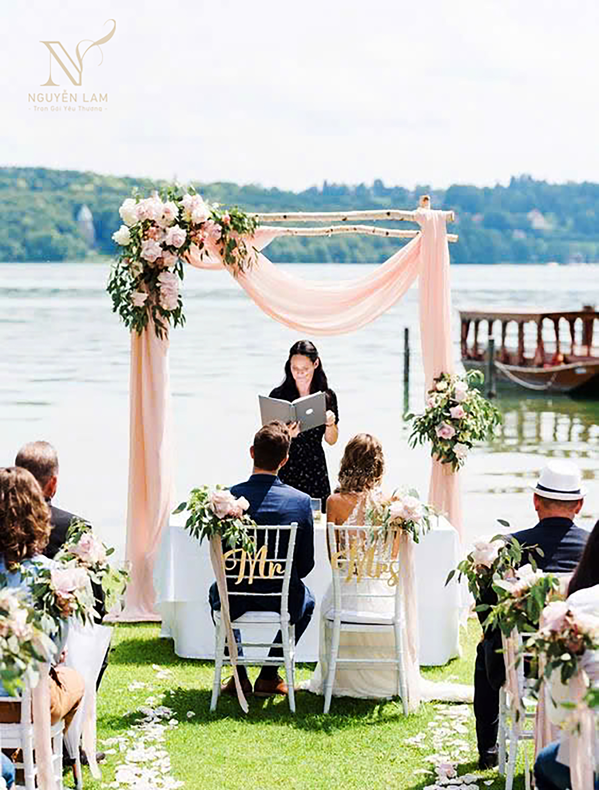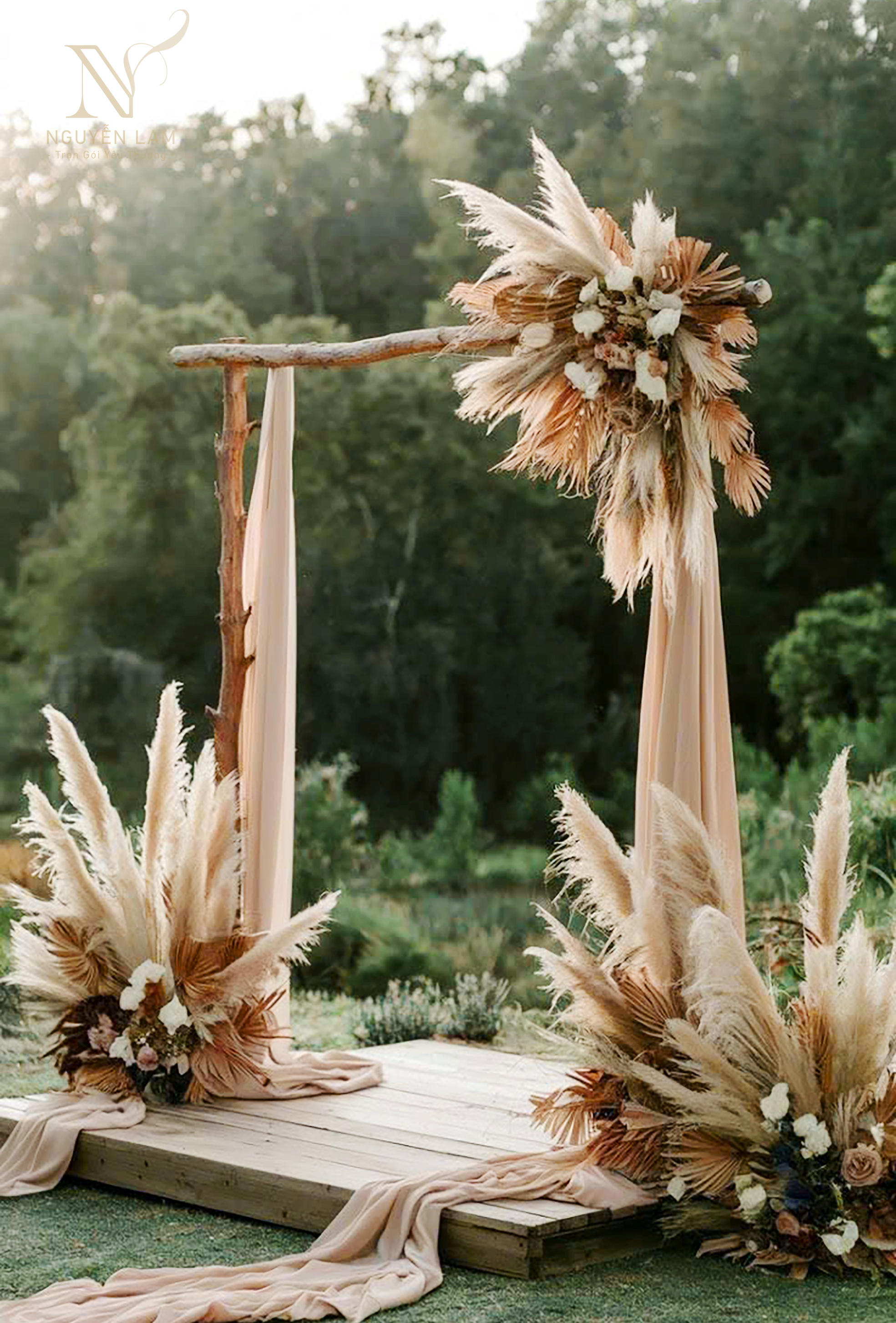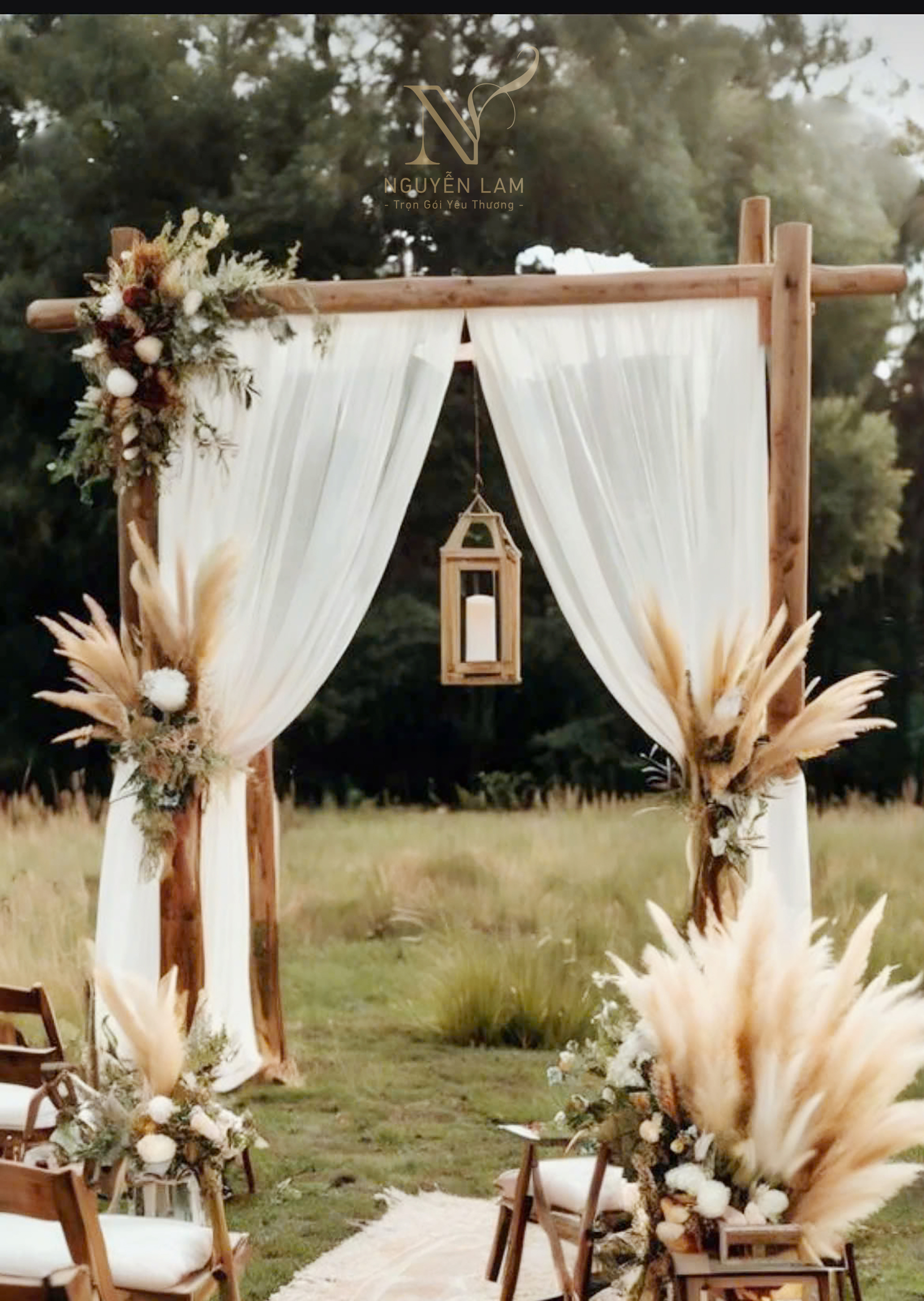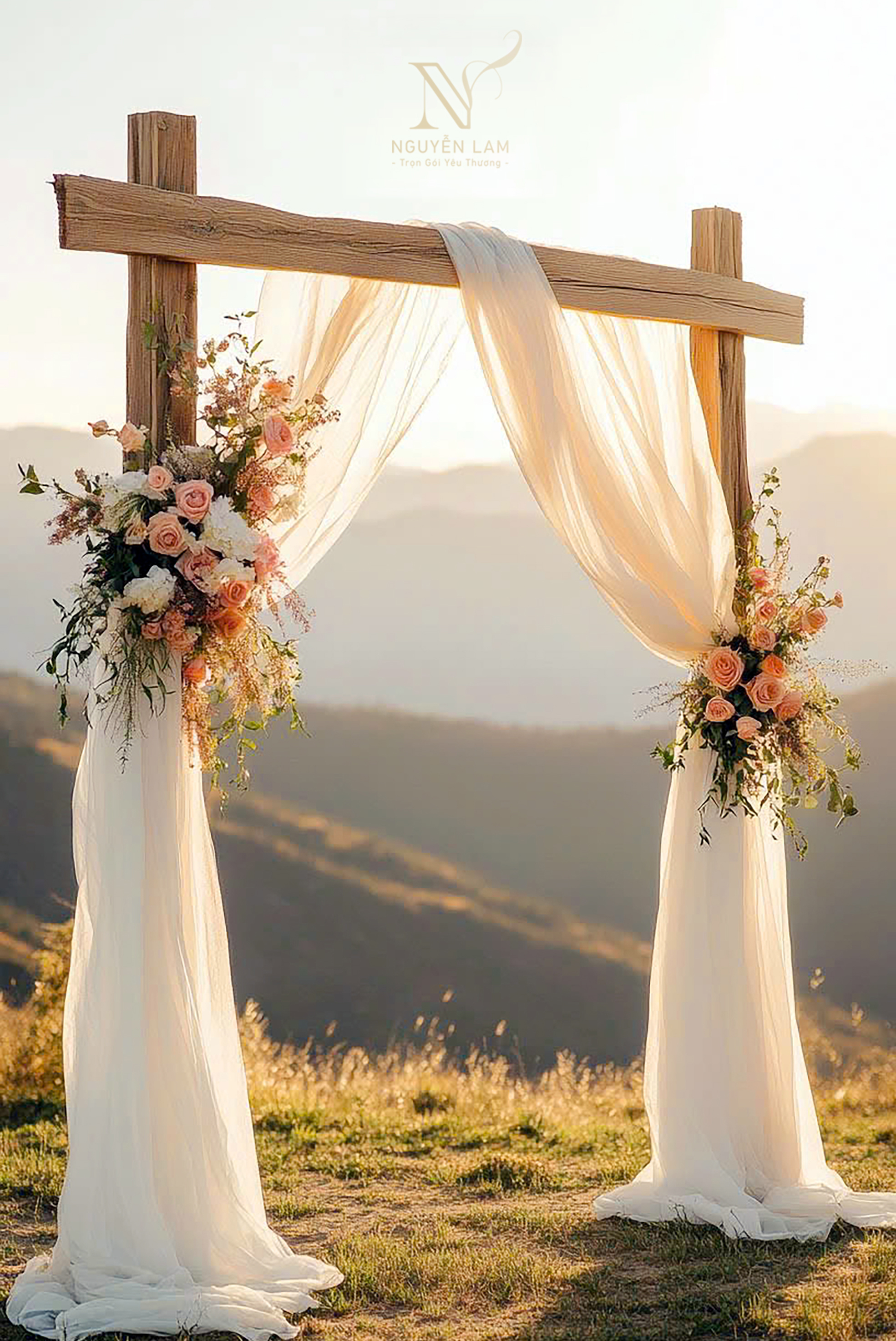 Cổng hoa gỗ tông vàng kem thiết kế theo đúng sở thích của dâu rể cá tính ,mạnh mẽ ,khác biệt ,với tông màu chủ đạo nóng tựa như lửa của tình yêu cháy bỏng nồng nhiệt ,kết hợp giữa phi yến nâu gổ ,lá táo nâu, phi yến ,hồng màu hồng da