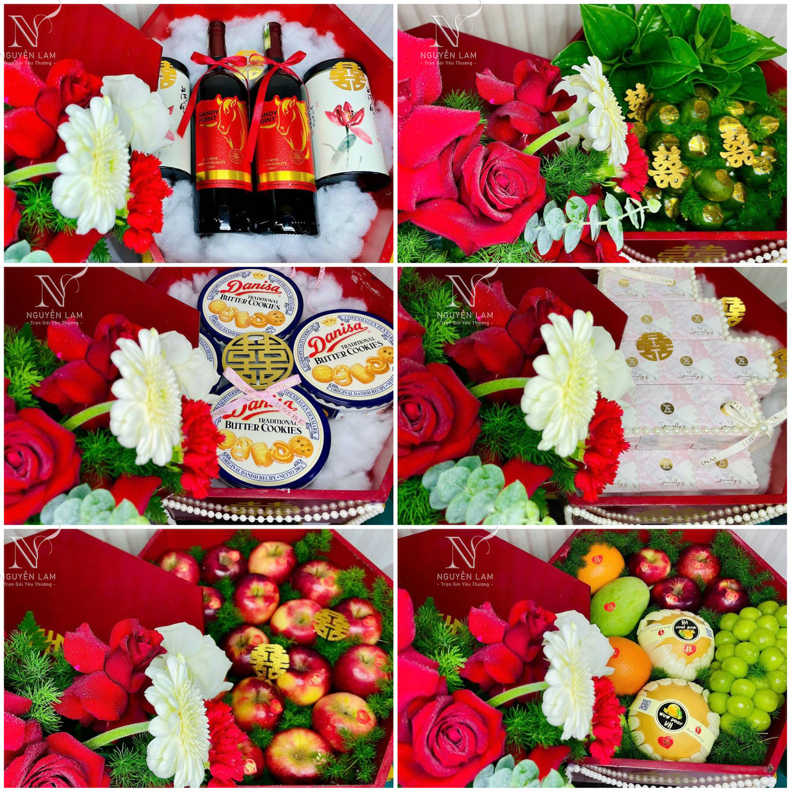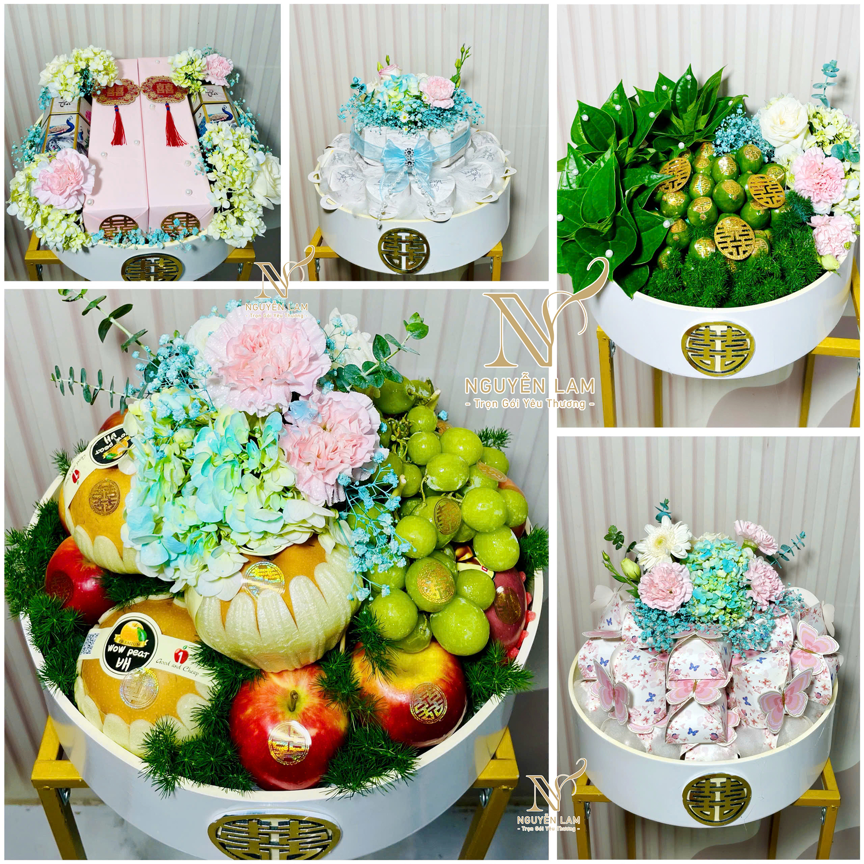 Mâm Quả Cưới Hiện Đại Giá chỉ từ 4.900.000 vnđ đến 6.900.000 vnđ Quý khách có thể lựa chọn tùy thích và điều chỉnh theo ý thích cho mâm quả: 1. Trà + rượu 2. Phụng trên trầu cau 3. Bánh cốm 4. Bánh phu thê 5. Bánh bía 6. Bánh kem 7. Bánh Danisa 8. Ngũ quả 9. Táo 10. Cam 11. Lê hàn 12. Socola 13. Xôi gà 14. Bia, nước ngọt,... ................................... ( khay rượu :1 bình, 1 chai rượu voka, 2 ly, 6 miếng trầu tem, 1 phong bì ) Xem thêm