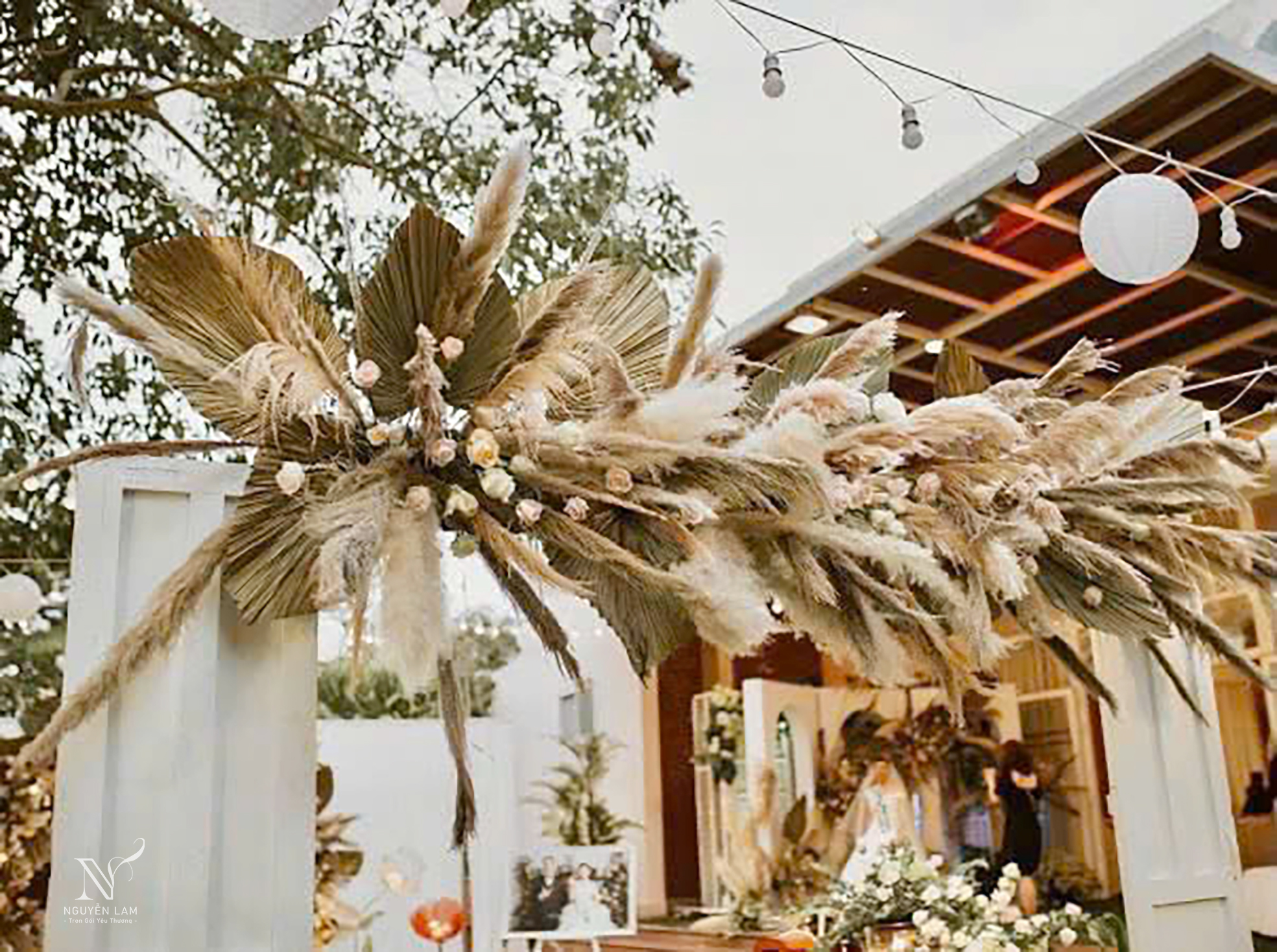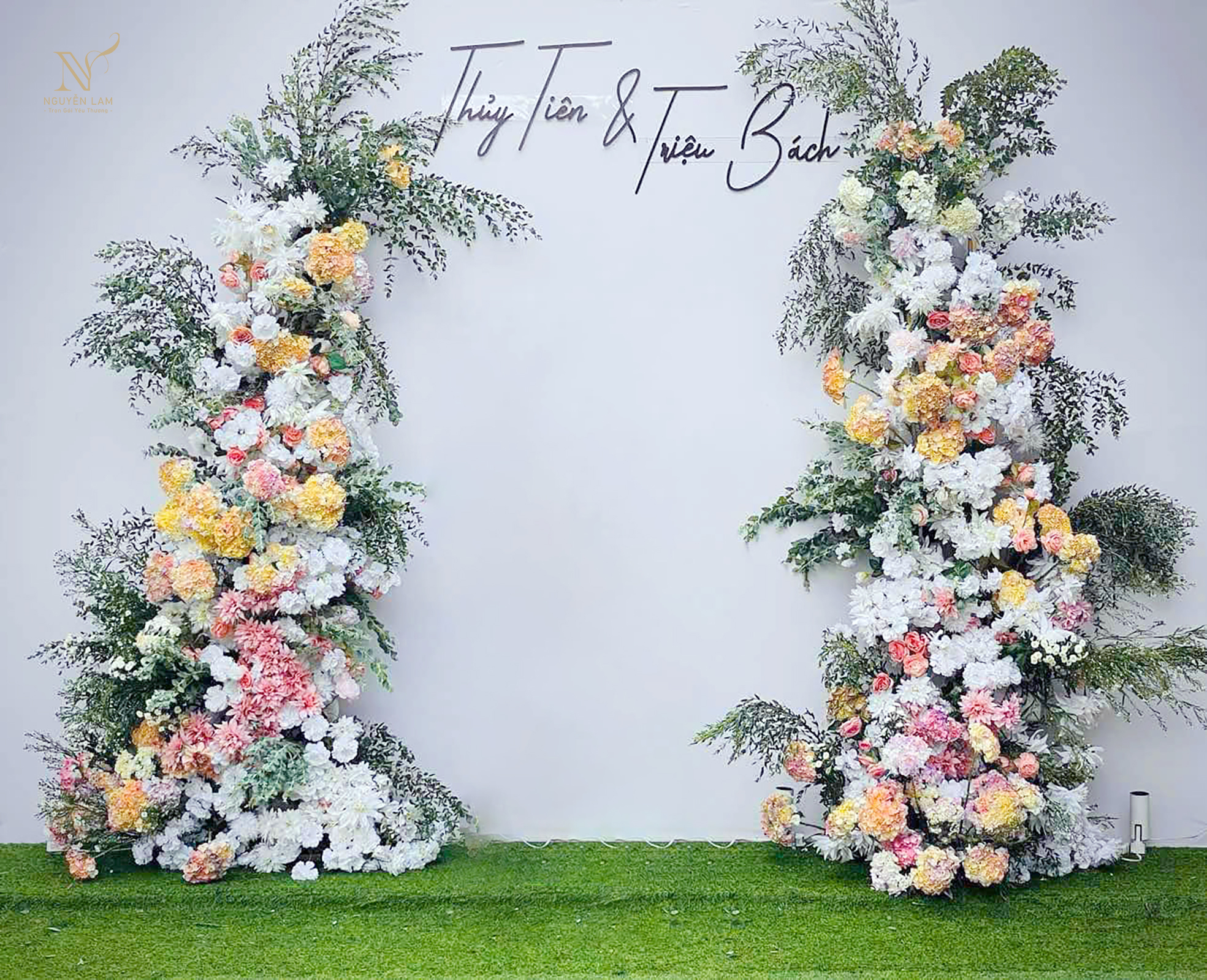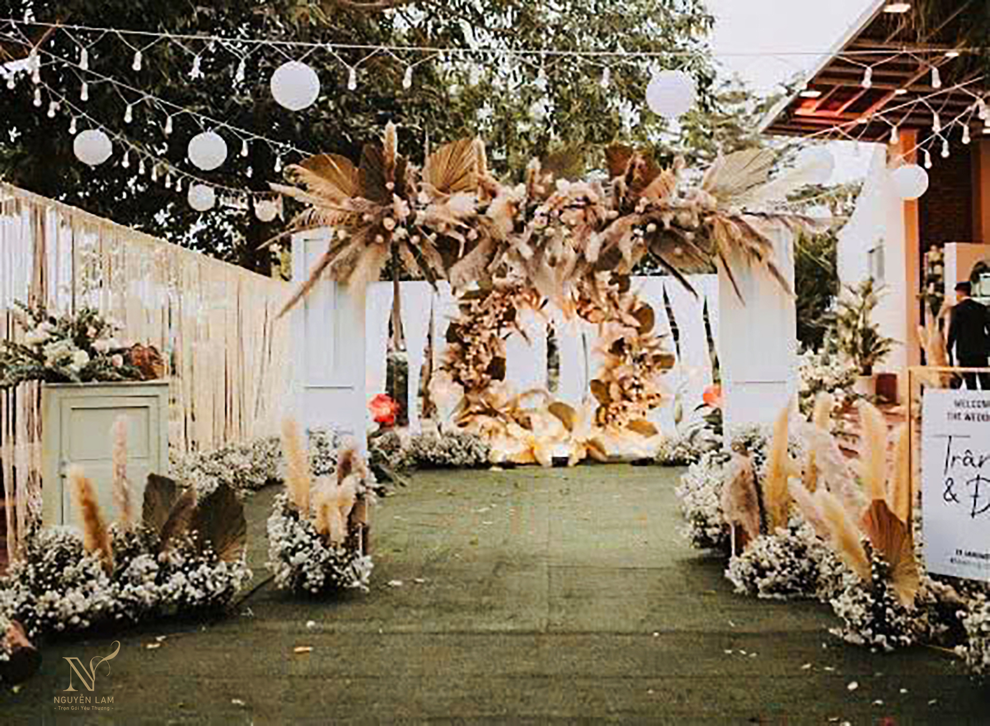 Cổng hoa (Wedding Arch): Điểm nhấn trung tâm của buổi lễ.