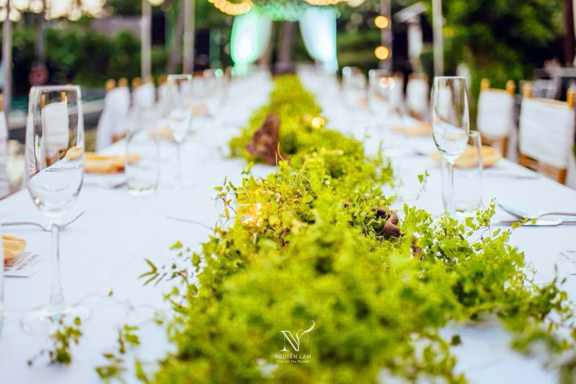 Khu vực đãi tiệc (Reception): Bàn ghế, khăn trải bàn, trung tâm bàn (centerpiece).